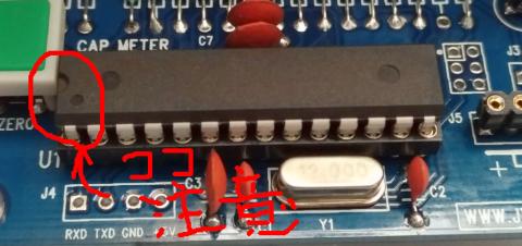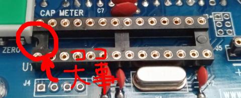 その上にICを乗っけます。これは向きがあって、それぞれの金属端子(足)に意味を持つので間違っても反対に付けてはいけません。切り欠きのある方にICの切り欠きを合わせて差し込みます。