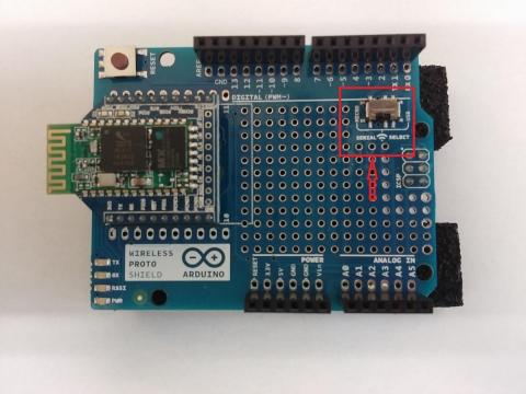 私はこのシールドに、XBee互換のSPP対応Bluetoothモジュール「Bluetooth Bee」を載せてみました。