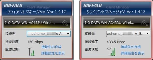 どちらも5GHz帯ですが、今までは左の画像の様に150Mbps、EX6100を親機にした場合は右の様に433.5Mbpsで繋がっています。
