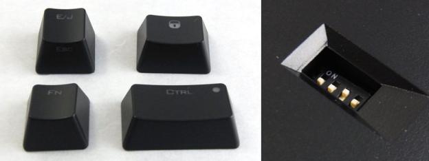 背面ディップスイッチで「Winキー無効化」「WinキーをFnキーへ」「Escキーを半角/全角キーへ」「左側ShiftとCapsLockを入れ替え」の操作が出来る。もちろんそれにあわせたキートップも付属。今回私は「Escキーを半角/全角キーへ」の設定とキートップ交換を行った。EscがFnキー同時押しになってしまうが半角/全角のほうがよく使うもんで。