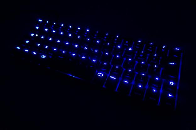LEDバックライトはブルーで、7段階の輝度調節とオンオフが可能。それぞれFnキー+CVBが割り振られる。最大輝度だとまぶしいくらいで、虫もびっくりするほど光物が好きな私でさえ実使用では輝度を4程度まで下げたくらいだ。