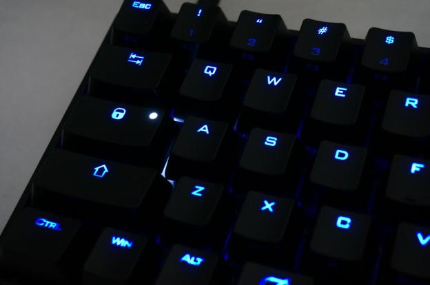 ブルーLEDバックライトを搭載しキーの刻印が光るギミックを持つのも同クラス製品では珍しい。ゲーマー向けキーボードでは最近増えてきたギミックだが。