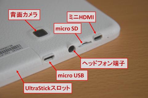 CLIDE 7の本体上部には、UltraStickスロット、microUSB、ヘッドフォン端子、microSD 、ミニHDMIポートが並んでいます。背面には、500 万画素カメラが配置されています。