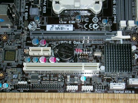 上からPCI-E×16、PCI-E×1、普通のPCIです。PCI-Eは両方ともGen2.0となります。また、下の方にはCOM、LPT、USB2.0×2(4ポート)分のピンヘッダがあります。