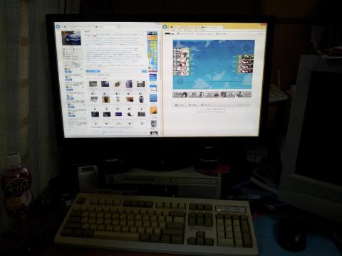 案外いけますw ディスプレイの後方、Mateの上にはPS3が置いてあります。手元が狭くなってしまったので、必然的にキーボードはミネベア。