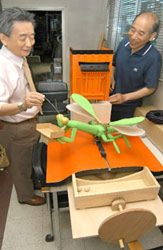200円で手前のハンドルを回すと、カマキリが羽を動かしながらくるりと回り、