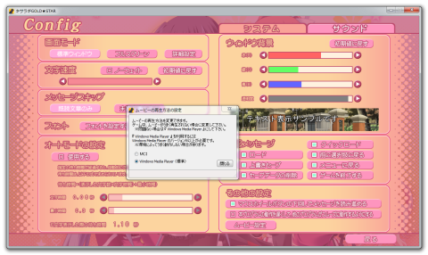 以前は「RealLive」(旧)と呼ばれるエンジンを使っていたわけですが、新では旧に無い「Win Vista以降の音量ミキサー設定がムービー再生時に適応されない」というバグが有ります。ムービー再生になると最大音量で流れるのでそれなりに覚悟が必要です。なお、このバグは現在の最新作である「カルマルカ*サークル」まで修正されていません。