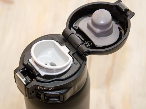 昔のワンタッチ式の保温ボトルだと、蓋が開いたときに蓋に付いていた内容物が飛び散って、服にシミが・・・て事がよくあったと思うんですが、本製品は、「飛び散り抑制機構」があるので心配要らずです。