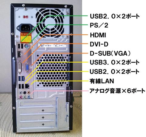USB2.0×6(内2ポートが前面)、HDMI+DVI+D-SUB