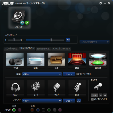 音源自体はメーカー製PCや自作PC用マザーボードでも良く見かけるRealtekの「ALC887」を搭載していますので、イコライザーやボイスチャット時のエコーキャンセル等が利用可能です。