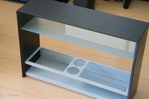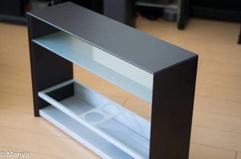 エッジの効いたコの字型の木枠に強化ガラスの仕切り&メタルのボトム収納と、