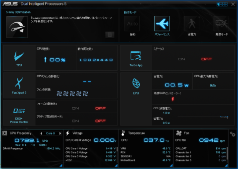 CPU温度はASUS AI Suite3、消費電力はエコキーパーを使用しました。