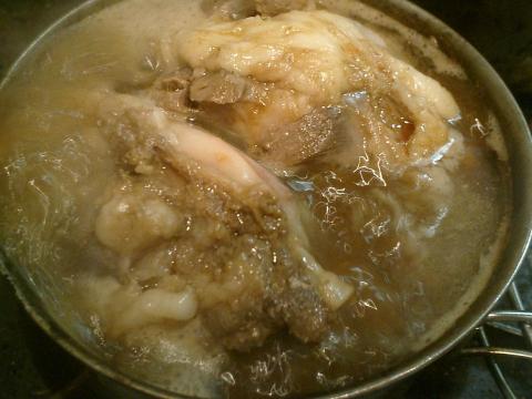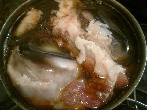 言われた通り、水にしょうゆとみりんをドボドボ注いでグツグツ煮込みます。塩も少々。