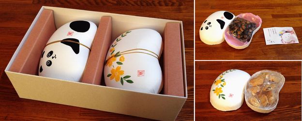 「まめや萬久」さんは「豆菓子」の老舗です。「パンダさん」には「黒豆炒り豆」、「黄色いバラ」には「しみみ」が入っていました。