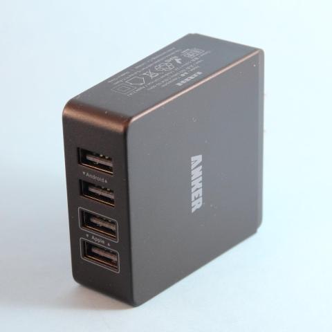 この製品には、2.1A出力ポートが1個と1Aポートが3個あって、4台の機器を充電できる。