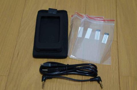 付属品は、専用ポーチ、シリコンジャケット、保護フィルム2枚、USB-miniUSBケーブル。