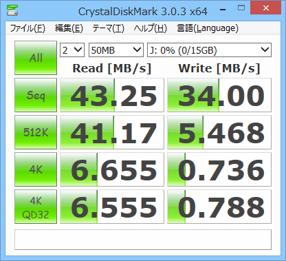 メディアの公称値の95MB/sが出ませんでした。別PC内臓のリーダーで試したところ、公称値が出ていたので、リーダーの性能だと思われます。