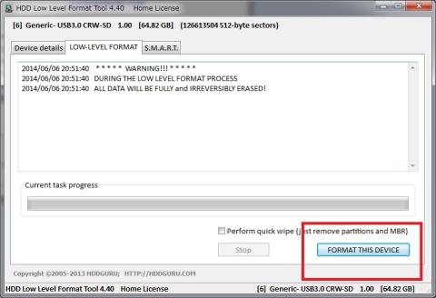 対象ドライブを選択後、LowLevel Formatタブを選択し、囲ったボタンを押すだけ。