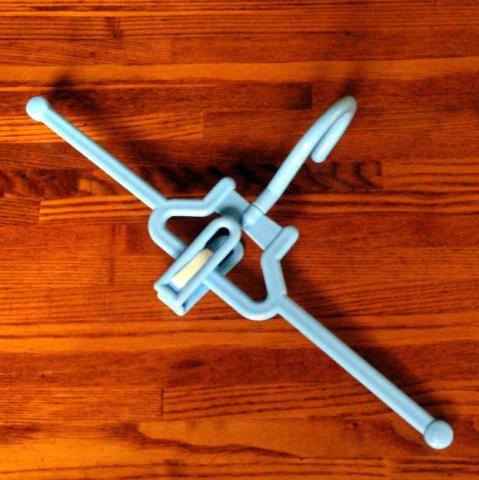 一般的に「クリップ付ハンガー」とか「スカートハンガー」、「ズボンハンガー」などと呼ばれる物です。(全部同じ物なのか、違う物なのかは分かりません)上着を吊るす物では無く、スカートやズボンなどを吊るします。