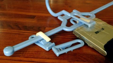 これを「無線LANの子機」のフックにしよう思いつきました。最初までは「ガムテープ」を使って固定していたのですが、余りにも汚くてzigsowでも公表は出来ませんでした。でも、透明で丈夫なテープがあるのを思い出し、使ってみました。