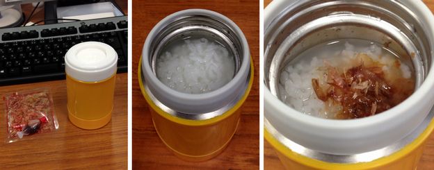 ボトルの中にご飯をかなり少な目に入れる。熱湯で一回洗い、お湯は捨てる。再び熱湯を注ぎ、蓋をしっかり閉める。お昼になったら蓋を開け、鰹節と適量の醤油を追加。ほとほどに温かい雑炊の出来上がり。