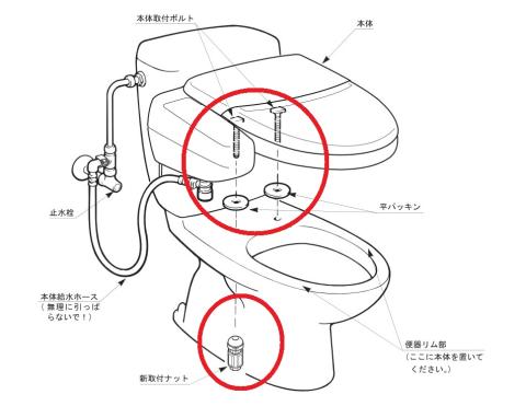 仕方なく、お湯を溢さない様、本体を水平にずらして取り付けボルトを後ろから差込して