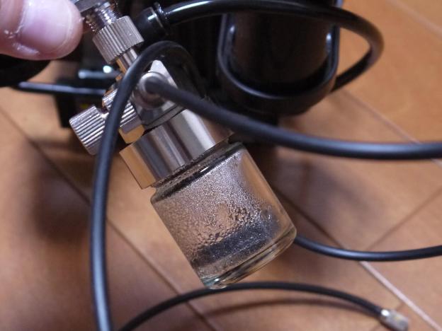 コンプレッサー→レギュレーター→エアブラシと繋ぎますが、水が溜まる瓶には霜が結構付いているのを見ると、付けていて良かったなと思います。