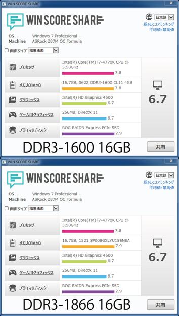 DDR3-1866とDDR3-1600の比較では、僅か3%ほどスコアが伸びただけでした。