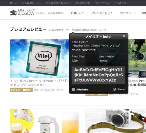 例えば、「Zigsow」のラウンジページの文字を「WhatFont Tool」を使って調べてみると、"メイリオ"の表示が。メイリオといえば、Windows Vistaから導入されたシステムフォントのことです。つまり、OSの指定したフォントでブラウザが表示されているのだけなので、ZigsowはWebフォントを使ってないって事ですね。