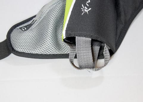 下部はナイロンベルトが交差してボトルを受け止めるようになっており、口には落ちないようにボトルの首にかけるゴムが付いています。
