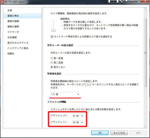 こちらは「アプリの設定」-「番組の設定」で、それぞれ早見再生開始時の再生スピードを何倍速にするかやフラッシュボタンを押した時に何秒進ませる(戻す)か設定する事が出来ます。