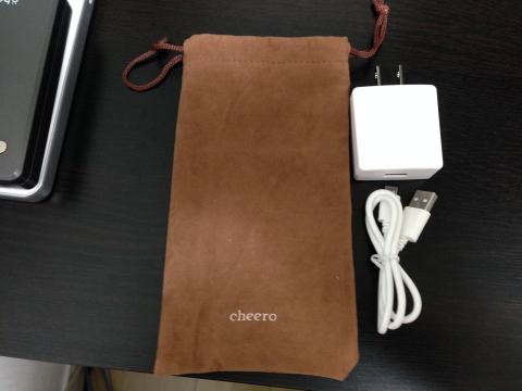 付属品は、2Aの充電器とUSBケーブルとCheeroマーク入り袋です。