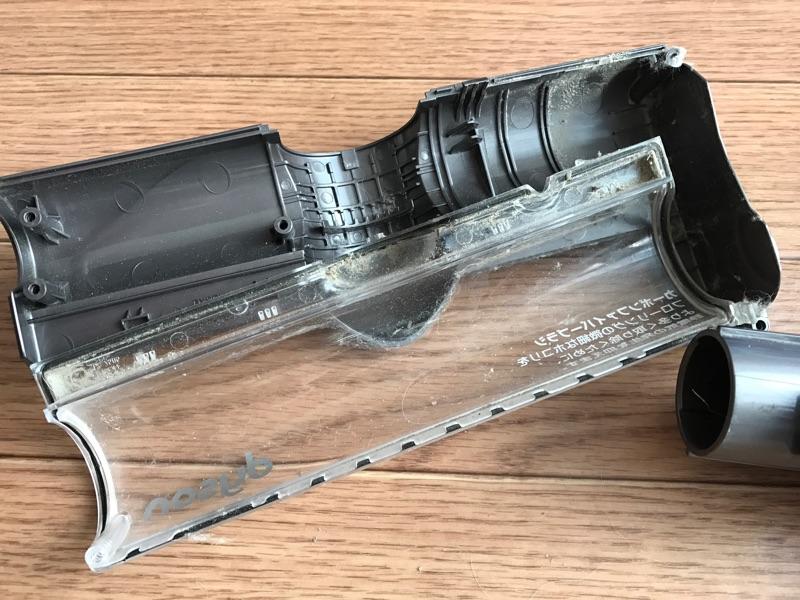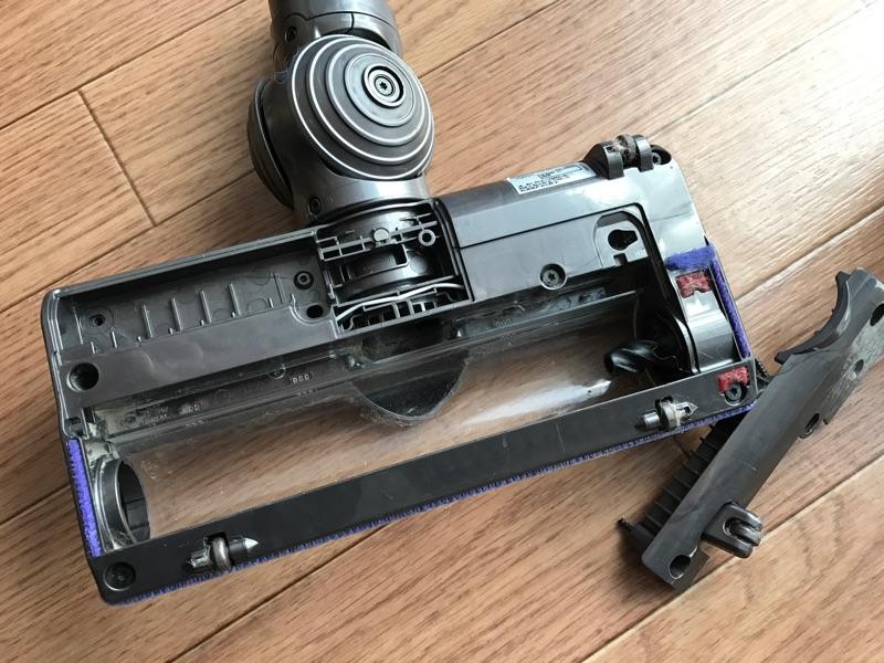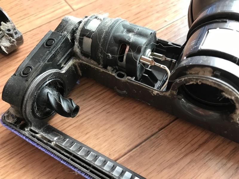 このもちもの冒頭で書いた件です。本掃除機のモーターヘッド部分にあるブラシが回転しなくなってしまい、まともに掃除ができなくなってしまったので分解して清掃することにしました。故障時に怪しそうなところを見ていて、ブラシの回転部分に毛が詰まっているのを確認したため、ヘッドを分解して清掃する必要があると判断していました。