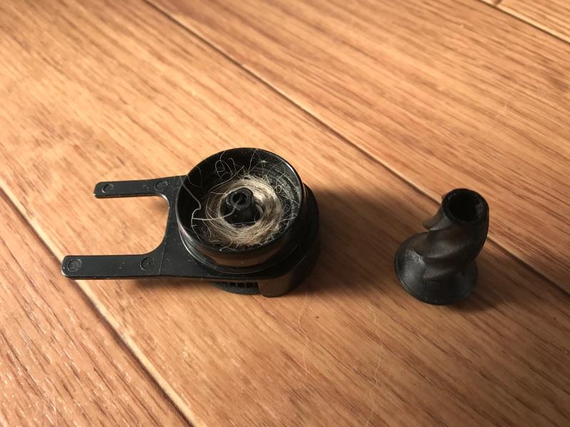 黒くなっているのは、ベアリングまで達したもので、ベアリングに塗られていた潤滑剤が毛に付着してしまっています。これだけ中にまで詰まっていれば動かなくもなります。