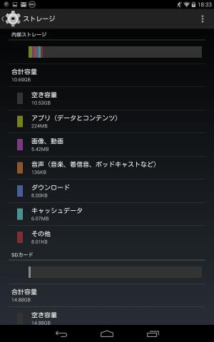 プレインストールされたアプリを紹介するまえに、初期状態におけるストレージの空き容量を確認しておきます。スクリーンショットではSDカードの容量も表示されていますが、これは手元にあったキングストンのSDカードを挿入していたからです(クリックで拡大画像が見られます)。