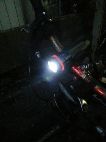 ライトは非常に明るく、自転車用のライトとして十分活用できます。これは良い買い物だと思いました。ライトは3モードあり、点灯モード(強く押す。)、エコ点灯モード(軽めに押す。)、点滅モード(再度軽くプッシュして押す。)です。私の場合は点灯モードのみ使用しています。(写真上)