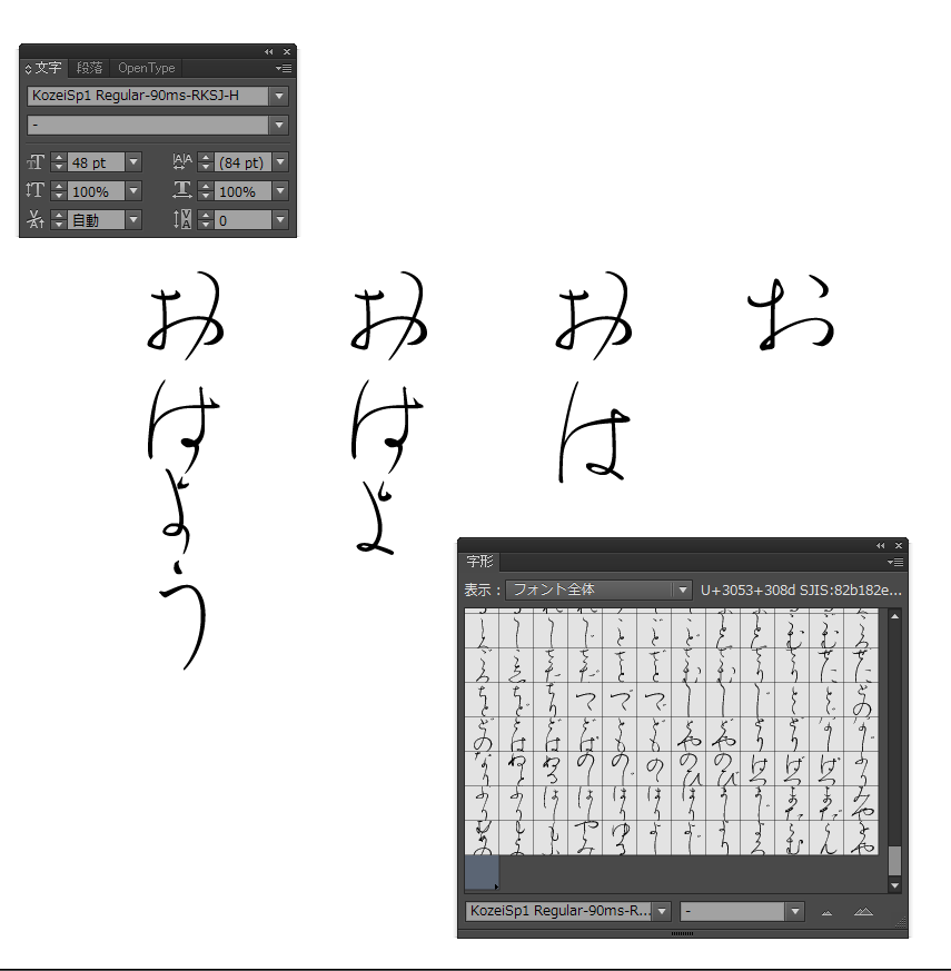 古筆の仮名は連綿でもって綴られており、文字の繋がりは書き手により左右され、字形が変わりますが、それをデジタルな書体でありながら、「こうぜい」は文字の繋がりをコントロールすることが出来ます。