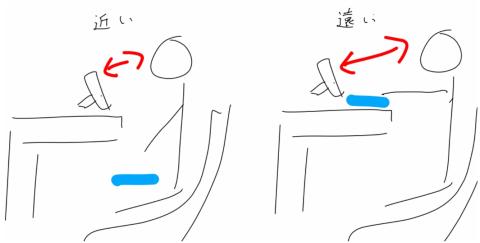 赤が目とディスプレイの距離、青がキーボードの位置です。