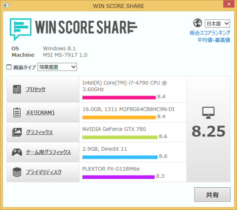 WIN SCORE SHAREというフリーソフトを使って測定しました。