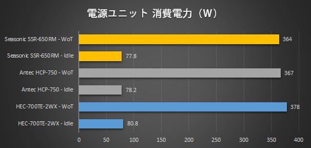 結果は、80PLUS GOLD対決ではわずかにSSR-650RMが勝利となり、80PLUS BRONZEのHEC電源とは高負荷時に14W、アイドル時に3Wの差が出る結果となりました。