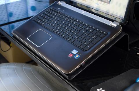この傾斜、ノートパソコンだとモニター部が上に持ちあがるので、普通のデスクトップ感覚の視線で見れますね。