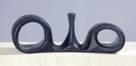 両輪っかの部分にそれぞれ親指と薬指を通し、真ん中の突起部分を人差し指と中指で挟み、全部の指が軽く開いた状態になるようになっています。
