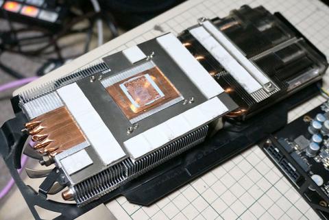 こちらはクーラー側。GPUチップ部以外にもしっかり熱伝導の素材が貼り付けられている。幸い粘着力があるタイプではなく押し付けるタイプだったので一度外してもそのまま戻せる。