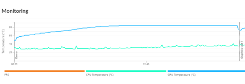 こちらはFireStrikeを回したときの温度グラフデモ部抜き取り。の場合デモの中盤(1分程度)で84度に到達。そこから先は温度が84度に張り付くようになる。