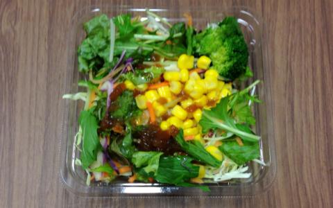 ドレッシングには、「刻み玉葱」も入っている様です。「ジュレ」ではありません。「ジュレ」は気持ち悪くて食べられません。「うな重のジュレダレ」なんて、絶対に口にしません。話が飛んでしまいましたが、「とうもろこし」や「ブロッコリー」、「水菜」、「キャベツ」や「ニンジン」なども入っています。新鮮で元気な生野菜ばかり。これで163円ですから、素晴らしいです。