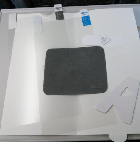 店頭で見ていると、ASUS純正にはグレア/アンチグレアの2枚が入っていることに気付いた。
