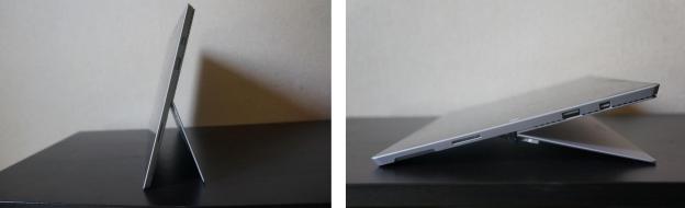 本体背面にはSurfaceの大きな特徴の一つ、キックスタンドが搭載されています。写真のように柔軟な角度で机に立てて置くことができ、Type Coverと組み合わせればノートパソコンと同様のスタイルで使用することができます。