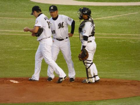ハフマンは外角の変化球に全く合わず空振り三振。今江はカウント3-1から高めに抜ける球を見送りフォアボール。ここでブラゼル・福浦の不在(福浦はベンチ入りしているが、左手の怪我により代打のみの起用)による一塁手となっている根元だが、やはりというべきか空振り三振。続くクルーズも中飛でこの回も無得点。H4 - 0M。