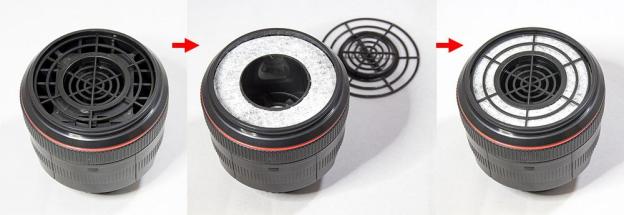 フィン中心のつまみを左にまわすと外れるので、専用フィルタを筒の外側にはめ込みます。