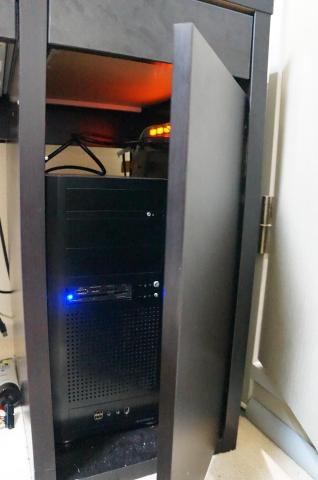 机のサイドにあるこのような棚の部分にPCを入れているため、中がかなり籠ってしまうため隙間にファンを取り付けて空気が流れるようにするために使用しています。